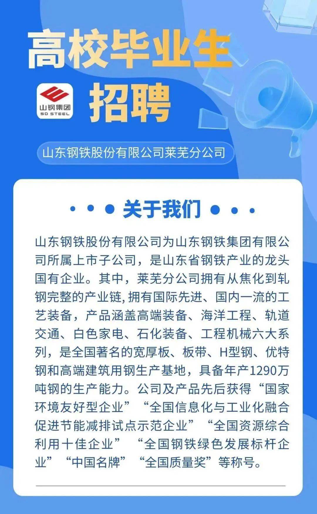 我們誠邀有激情、有夢想、有才華的你加入萊蕪鋼鐵集團,無論你是剛從校園走出的大學(xué)生,還是有一定工作經(jīng)驗的職場人士,這里都有屬于你的舞臺,讓我們一起創(chuàng)造輝煌,共同書寫美好的未來。